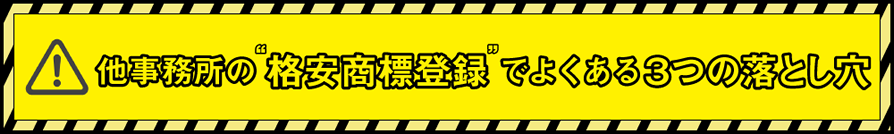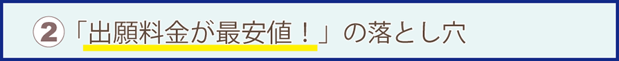 WEB広告やSEO上クリックされやすくする為に、商標出願までの料金を表記し、安く見せる格安商標登録サービスが多くみられます。